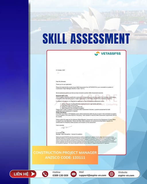 Một bước tiến quan trọng trong hành trình định cư Úc — bạn đã chính thức được công nhận kỹ năng nghề Construction Project Manager (ANZSCO 133111) từ VETASSESS!
