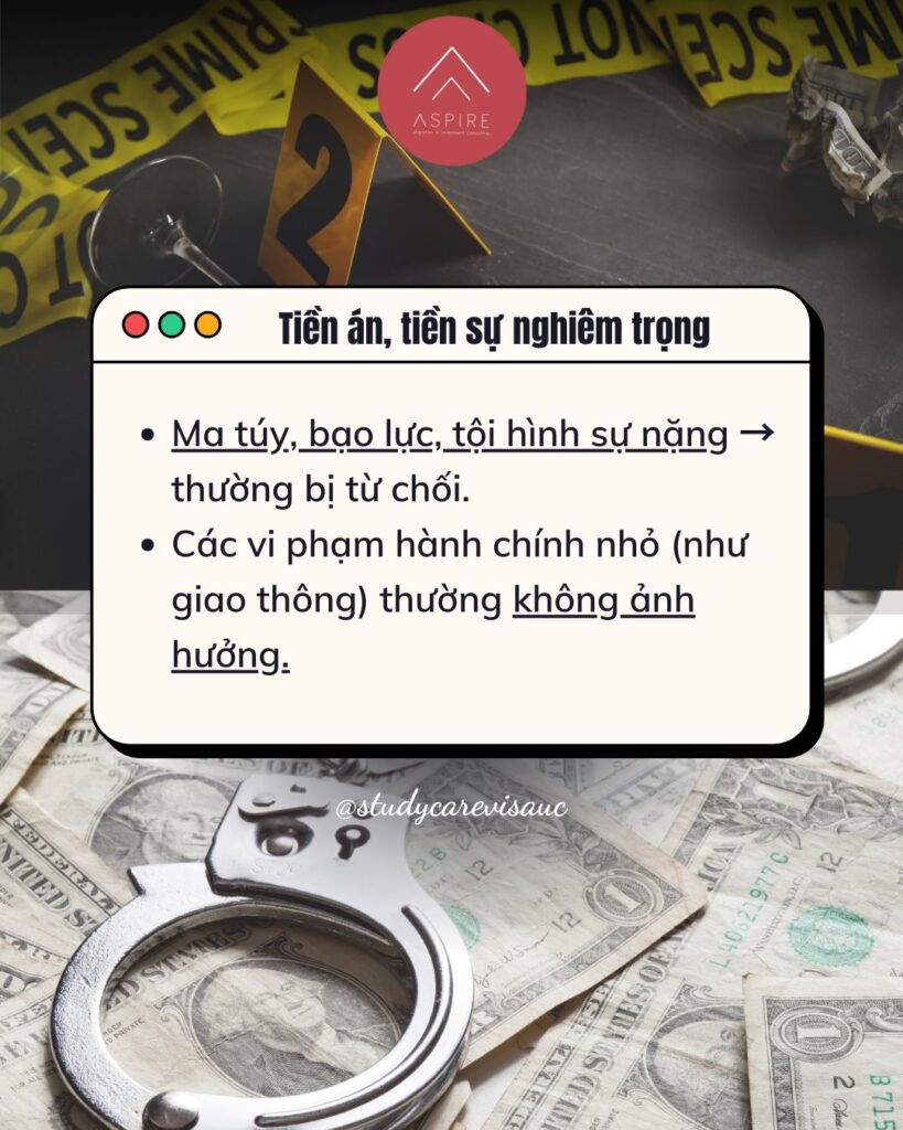 + Các vi phạm hành chính nhỏ (ví dụ phạt giao thông bình thường không kèm tội hình sự) thường không ảnh hưởng, trừ khi có yếu tố nghiêm trọng (ví dụ DUI, lái xe gây tai nạn).