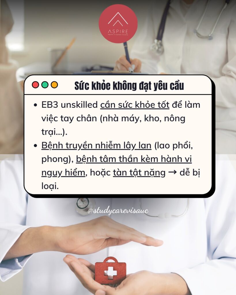 + Nếu có bệnh truyền nhiễm lây lan (ví dụ lao phổi, phong) mà không chữa được, bệnh tâm thần kèm hành vi nguy hiểm, hoặc tàn tật nặng, thì có thể làm tăng khả năng bị từ chối theo “health-related grounds.”
