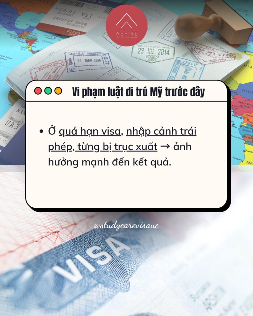 + Ở quá hạn visa, nhập cảnh trái phép, bị trục xuất, có thời gian cư trú không hợp lệ — các yếu tố này được xem xét khi xét inadmissibility→ ảnh hưởng mạnh đến kết quả được cấp visa hay không.