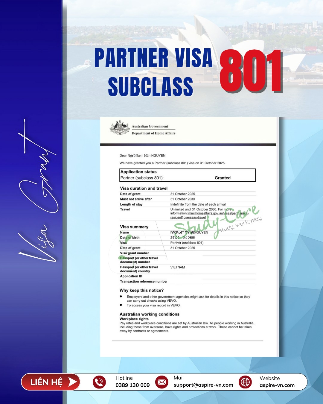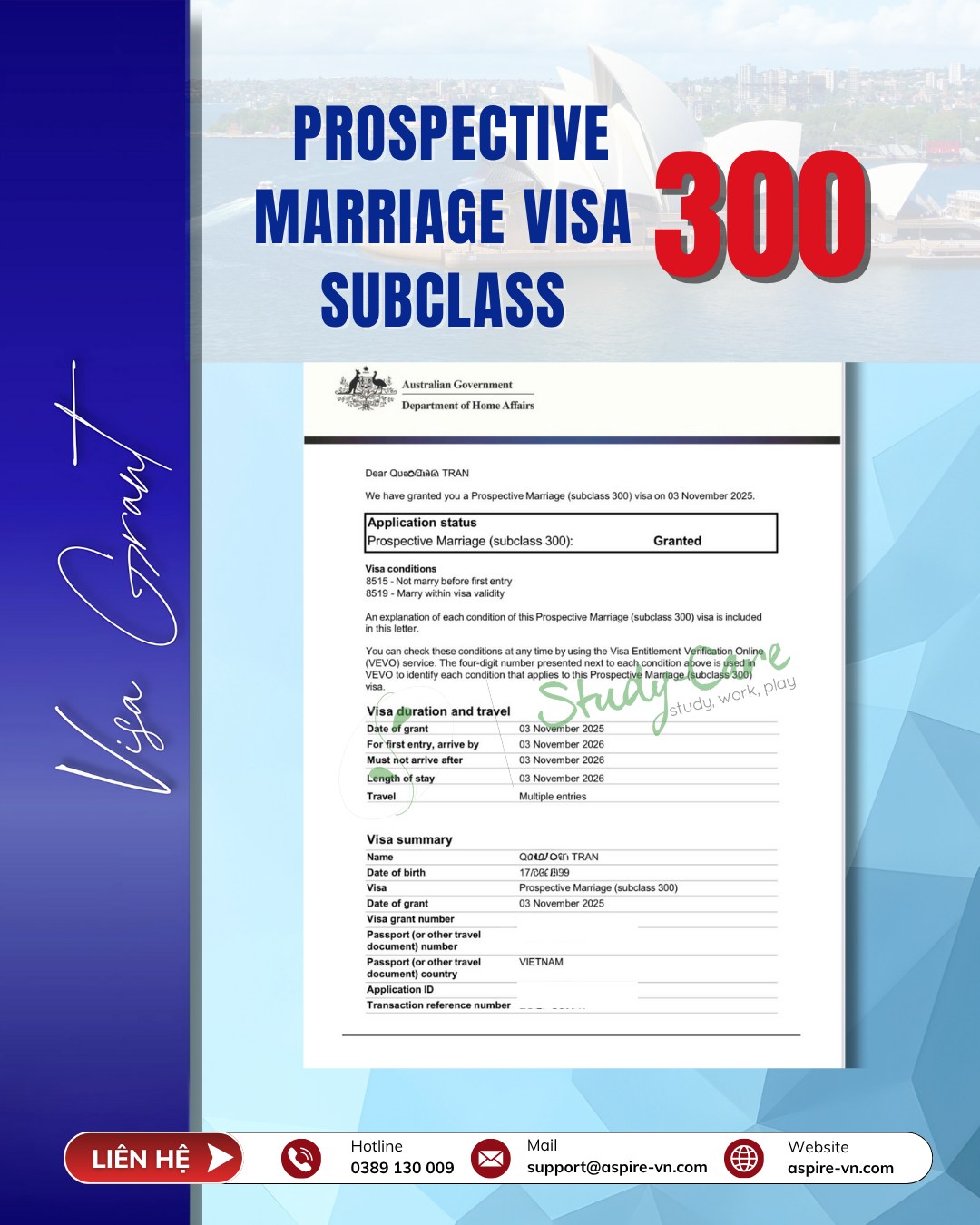 Thêm hai hồ sơ Partner Visa (Subclass 801) và Prospective Marriage Visa (Subclass 300) đã chính thức được cấp visa – minh chứng rõ nhất cho sự chuẩn bị kỹ lưỡng và chiến lược xử lý hồ sơ thông minh từ đội ngũ Study-Care!