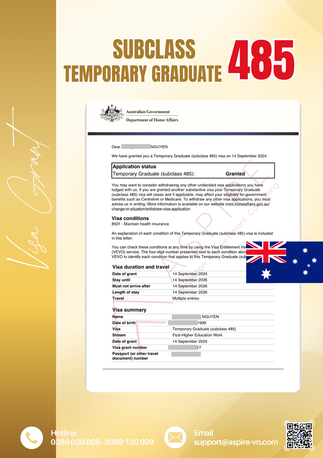 Một bước tiến vững chắc trên hành trình chạm đến giấc mơ định cư Úc!Aspire xin chúc mừng bạn #N, đã chính thức được cấp visa 485 – Temporary Graduate (Post-Higher Education Work)